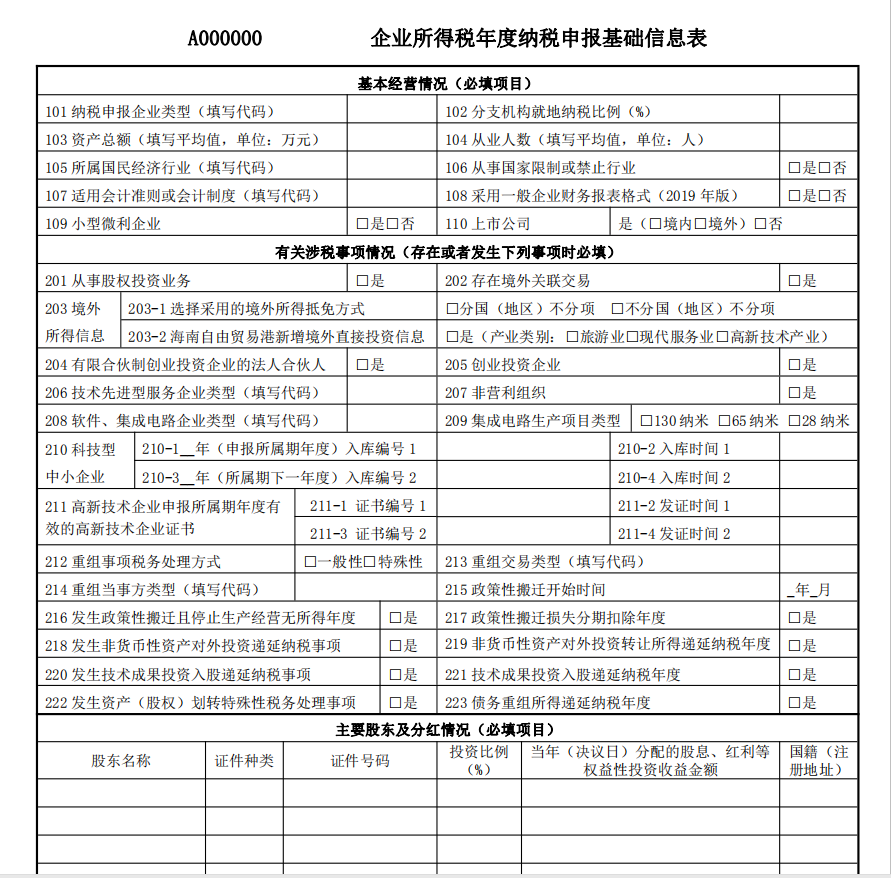 A000000《企業(yè)所得稅年度納稅申報基礎(chǔ)信息表》中:基本經(jīng)營情況為小微企業(yè)必填項目,“有關(guān)涉稅事項情況”為選填項目有關(guān)涉稅事項情況發(fā)生時才填報,主要股東及分紅情況為免填項目。