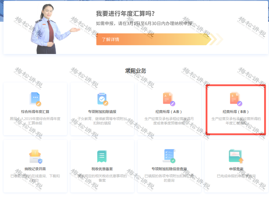 (1)首頁下方常用業(yè)務(wù)處,點擊“經(jīng)營所得(B表)”;