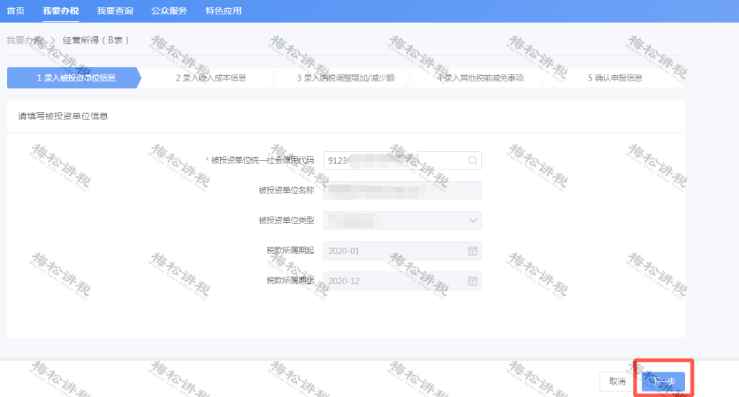 (3)錄入被投資單位信息,輸入納稅人識別號,點擊“下一步”;