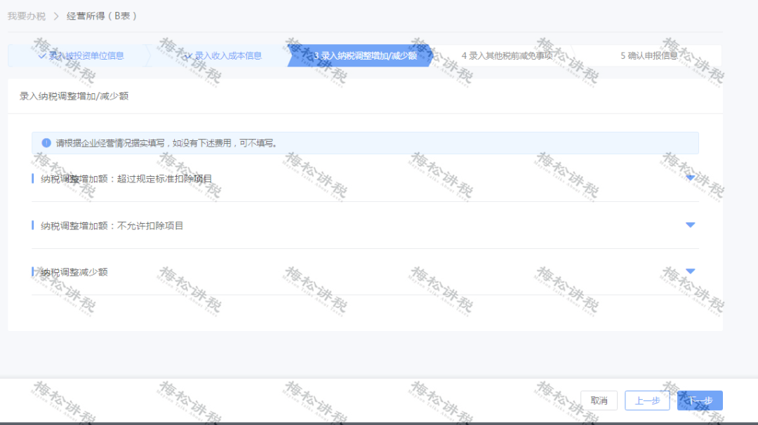 (5)錄入納稅調(diào)整增加/減少額,若企業(yè)沒有相關(guān)納稅數(shù)據(jù)可直接點擊【下一步】;