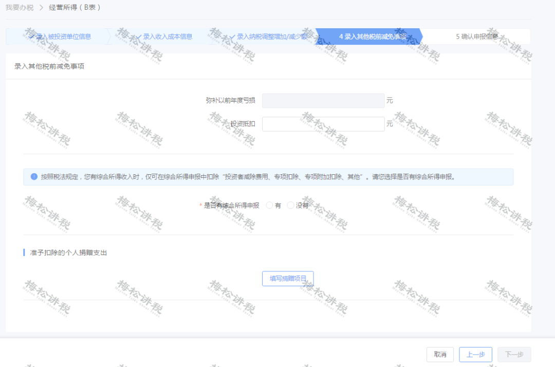 (6)錄入其他稅前減免事項,若企業(yè)沒有相關(guān)納稅數(shù)據(jù)可直接點擊【下一步】(若有準予扣除的捐贈支出,則在此環(huán)節(jié)錄入);