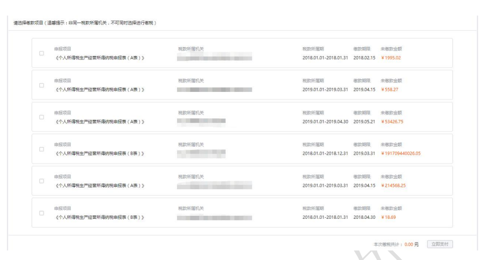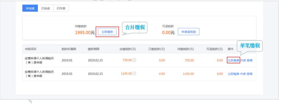 1、自然人電子稅務(wù)局網(wǎng)頁(yè)端(推薦使用) 建議納稅人通過自然人電子稅務(wù)局網(wǎng)頁(yè)端進(jìn)行繳納稅款!!!網(wǎng)址:https://etax.chinatax.gov.cn/納稅人在2021年1月完成2020年12月申報(bào)表提交后,所屬期2020年12月的稅款會(huì)與所屬期4月至11月緩繳稅款一并繳納。具體操作方法:點(diǎn)擊【我要查詢】-【申報(bào)查詢】-【未完成】,選擇對(duì)應(yīng)申報(bào)項(xiàng)目進(jìn)行繳稅,如有多條未繳款記錄可點(diǎn)擊【立即繳稅】(僅同一個(gè)稅款所屬機(jī)關(guān)、收款國(guó)庫(kù)的申報(bào)可合并繳稅)。