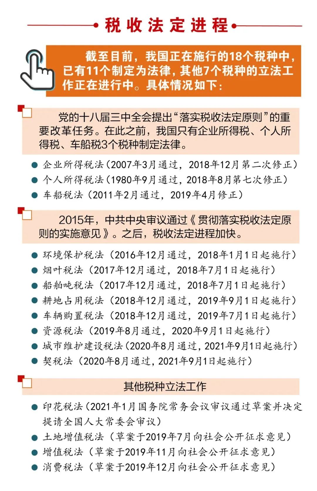 記者梳理發(fā)現(xiàn),“十三五”時期,我國的稅收立法工作取得較大進(jìn)展,先后制定了環(huán)境保護(hù)稅法、車輛購置稅法、契稅法等8部稅法,修正個人所得稅法、稅收征收管理法等5部稅法。截至目前,我國現(xiàn)行18個稅種中,立法稅種已達(dá)11個。此外,財政部、國家稅務(wù)總局已于2019年底將增值稅法(征求意見稿)、消費稅法(征求意見稿)向社會公布并征求意見;2021年1月,國務(wù)院常務(wù)會議審議通過了印花稅法(草案)并決定將草案提請全國人大常委會審議。