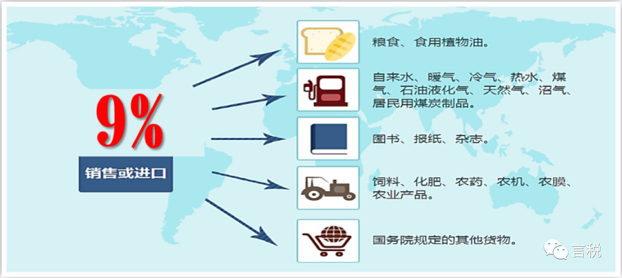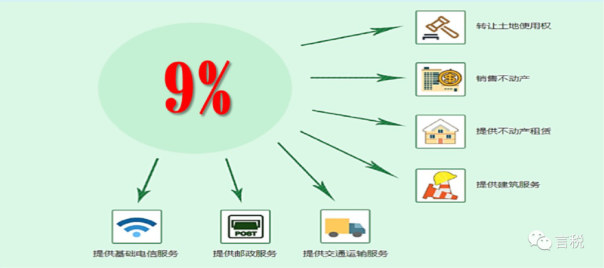 2、銷售交通運(yùn)輸服務(wù)、郵政服務(wù)、基礎(chǔ)電信服務(wù)、建筑服務(wù)、不動(dòng)產(chǎn)租賃服務(wù),銷售不動(dòng)產(chǎn),轉(zhuǎn)讓土地使用權(quán)以及銷售或進(jìn)口正列舉的農(nóng)產(chǎn)品等貨物(見附件1),稅率為9%;