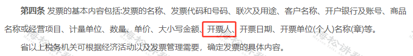 這里僅規(guī)定了“”開(kāi)票人”是發(fā)票的基本內(nèi)容,“復(fù)核人”屬于可填可不填項(xiàng)目。