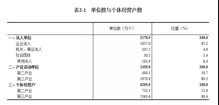 2018年末,全國共有從事第二產業(yè)和第三產業(yè)活動的法人單位2178.9萬個,比2013年末(2013年是第三次全國經濟普查年份,下同)增加1093.2萬個,增長100.7%;產業(yè)活動單位2455.0萬個,增加1151.5萬個,增長88.3%;個體經營戶6295.9萬個(詳見表2-1)。