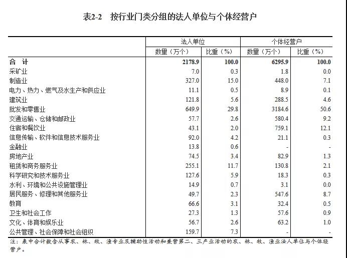 2018年末,在第二產業(yè)和第三產業(yè)法人單位中,位居前三位的行業(yè)是:批發(fā)和零售業(yè)649.9萬個,占29.8%;制造業(yè)327.0萬個,占15.0%;租賃和商務服務業(yè)255.1萬個,占11.7%。在個體經營戶中,位居前三位的行業(yè)是:批發(fā)和零售業(yè)3184.6萬個,占50.6%;住宿和餐飲業(yè)759.1萬個,占12.1%;交通運輸、倉儲和郵政業(yè)580.4萬個,占9.2%(詳見表2-2)。