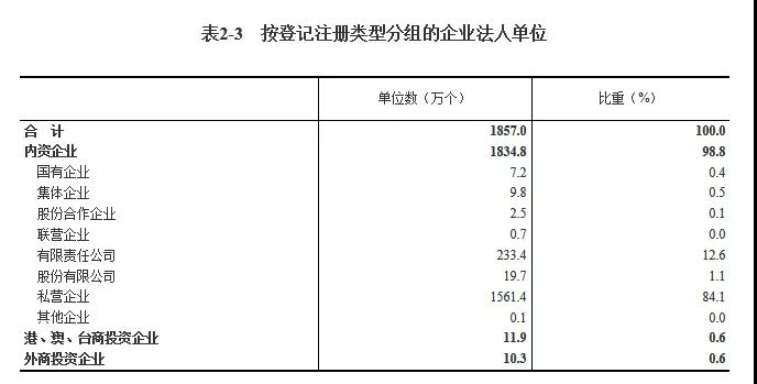 2018年末,全國共有第二產業(yè)和第三產業(yè)的企業(yè)法人單位1857.0萬個,比2013年末增加1036.2萬個,增長126.2%。其中,內資企業(yè)占98.8%,港、澳、臺商投資企業(yè)占0.6%,外商投資企業(yè)占0.6%。內資企業(yè)中,國有企業(yè)占全部企業(yè)法人單位的0.4%,私營企業(yè)占84.1%(詳見表2-3)。