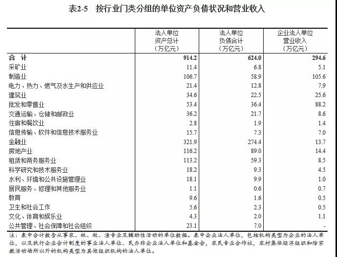 從資產(chǎn)看,2018年末,全國第二產(chǎn)業(yè)和第三產(chǎn)業(yè)法人單位資產(chǎn)914.2萬億元。從負(fù)債看,全國第二產(chǎn)業(yè)和第三產(chǎn)業(yè)法人單位負(fù)債624.0萬億元。從營業(yè)收入看,2018年,全國第二產(chǎn)業(yè)和第三產(chǎn)業(yè)企業(yè)法人單位營業(yè)收入294.6萬億元。